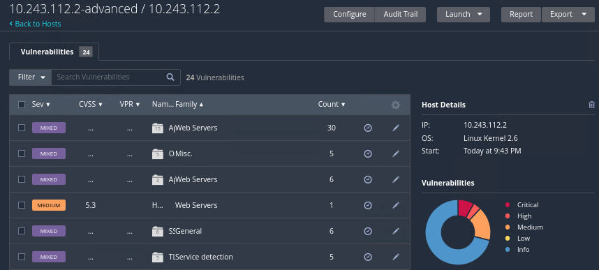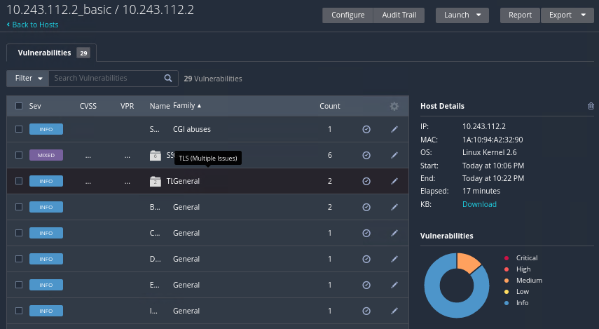 ==action: Save and click “Launch”, and view the results as they become available==. The Nessus scan is quite detailed, and will take some time to complete.