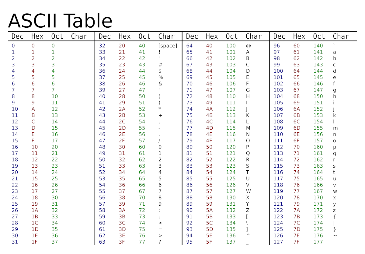 ASCII table showing character codes and their hexadecimal representations https://commons.wikimedia.org/wiki/File:Ascii-proper-color.svg