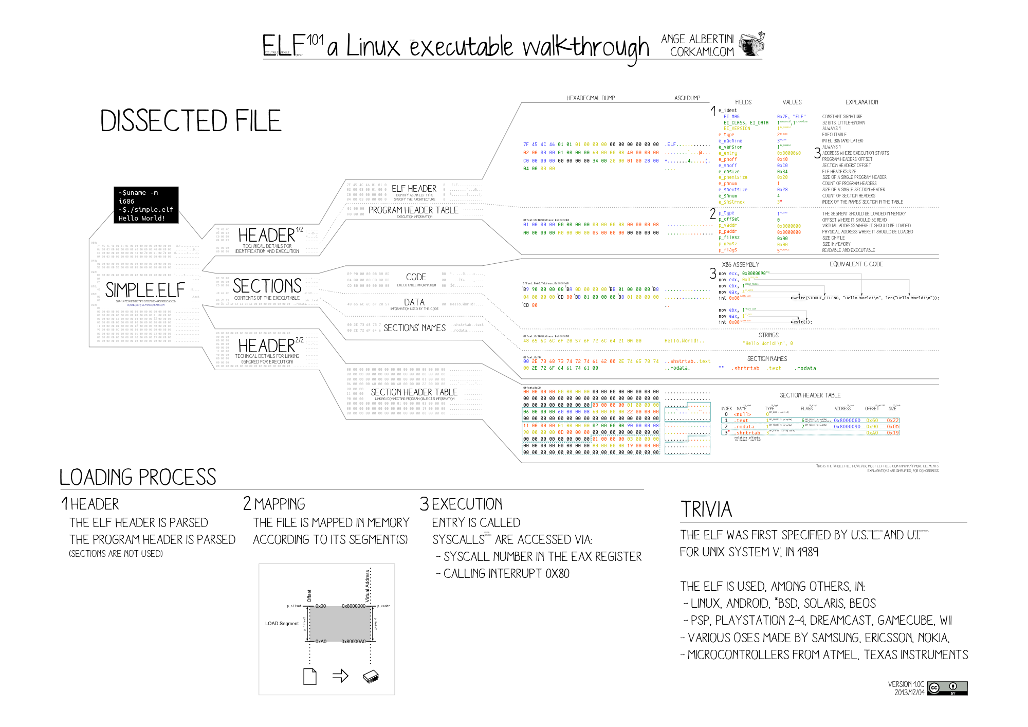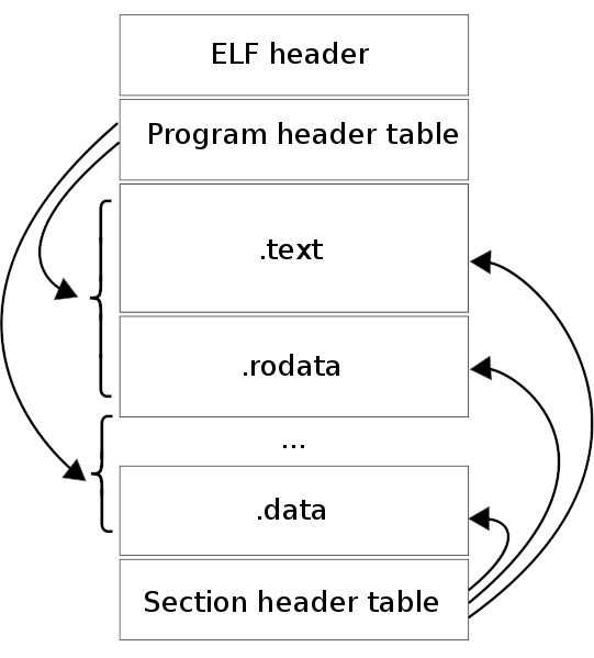 ELF file structure showing different sections and their purposes https://en.wikipedia.org/wiki/File:Elf-layout–en.svg