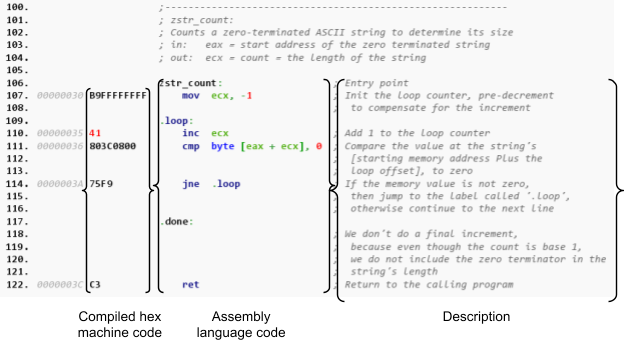 Very few people directly work with machine code in a binary or hex view, since this is almost indecipherable for a human; it is much more intuitive to view the instructions in an executable file as assembly code. Assembly language describes the low level instruction steps for a CPU using (many) short lines of code representing machine code instructions. At one point in history (before the 1980s) Assembly was the primary way that program code was written. The figure below shows an example of compiled machine code (such as “B9FFFFFFFF”) and the assembly that describes the instruction (“mov ecx, -1”). In this case, this instruction sets the ECX CPU register to the value “-1”, which is clearly easier to understand in the assembly code rather than the machine code that the computer runs.