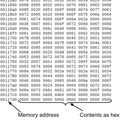 The most direct way of exploring the contents of an executable file is by viewing the exact data that is stored to disk. An executable file is stored in an OS-specific file format (more on this in the next section), and is typically a binary file, meaning it contains data (such as machine instructions, images, or sound) that is not meant to be interpreted directly as text to be read by humans.