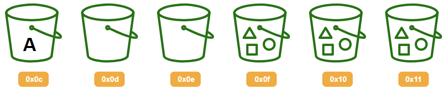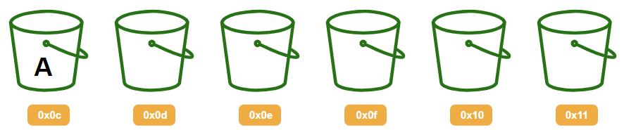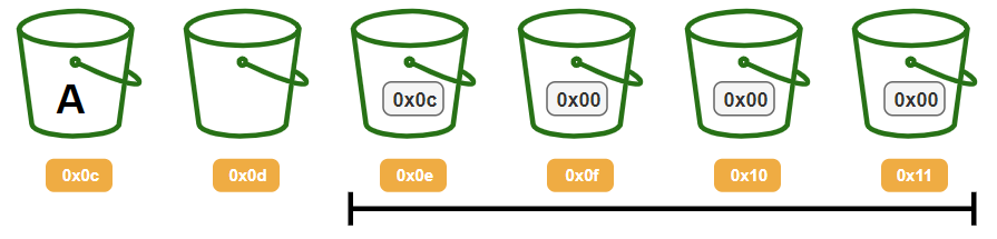 We know that the bucket’s address is 0x0c. What if we wanted to store this information somewhere? Well, first of all, we need to know the size of the address data type so we know how many buckets to allocate to it. As it happens, in 32bit systems, an address or pointer occupies 4 bytes in memory. Perfect, so let’s reserve 4 buckets to store our address.