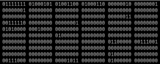 Output of “xxd -b simple” showing binary representation of the “simple” executable file