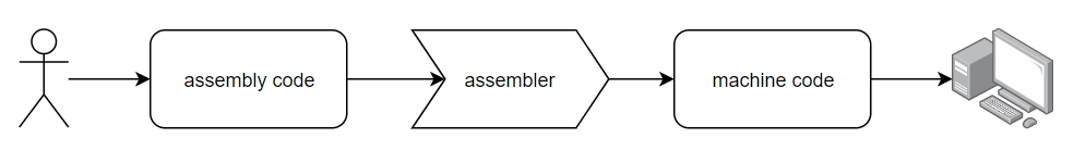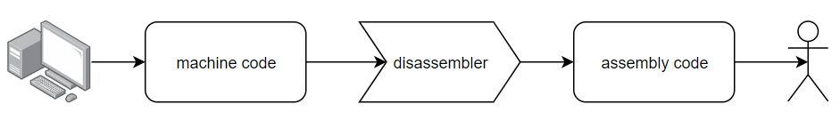 The diagram above shows how an assembler converts assembly instructions written by a developer into machine code which a computer can execute. Since the assembly instructions have a one-to-one relationship with machine code instructions, this is a simple conversion to make. As a malware analyst, you should note that it is also just as simple to reverse the process and convert machine code into assembly code which you can read.
