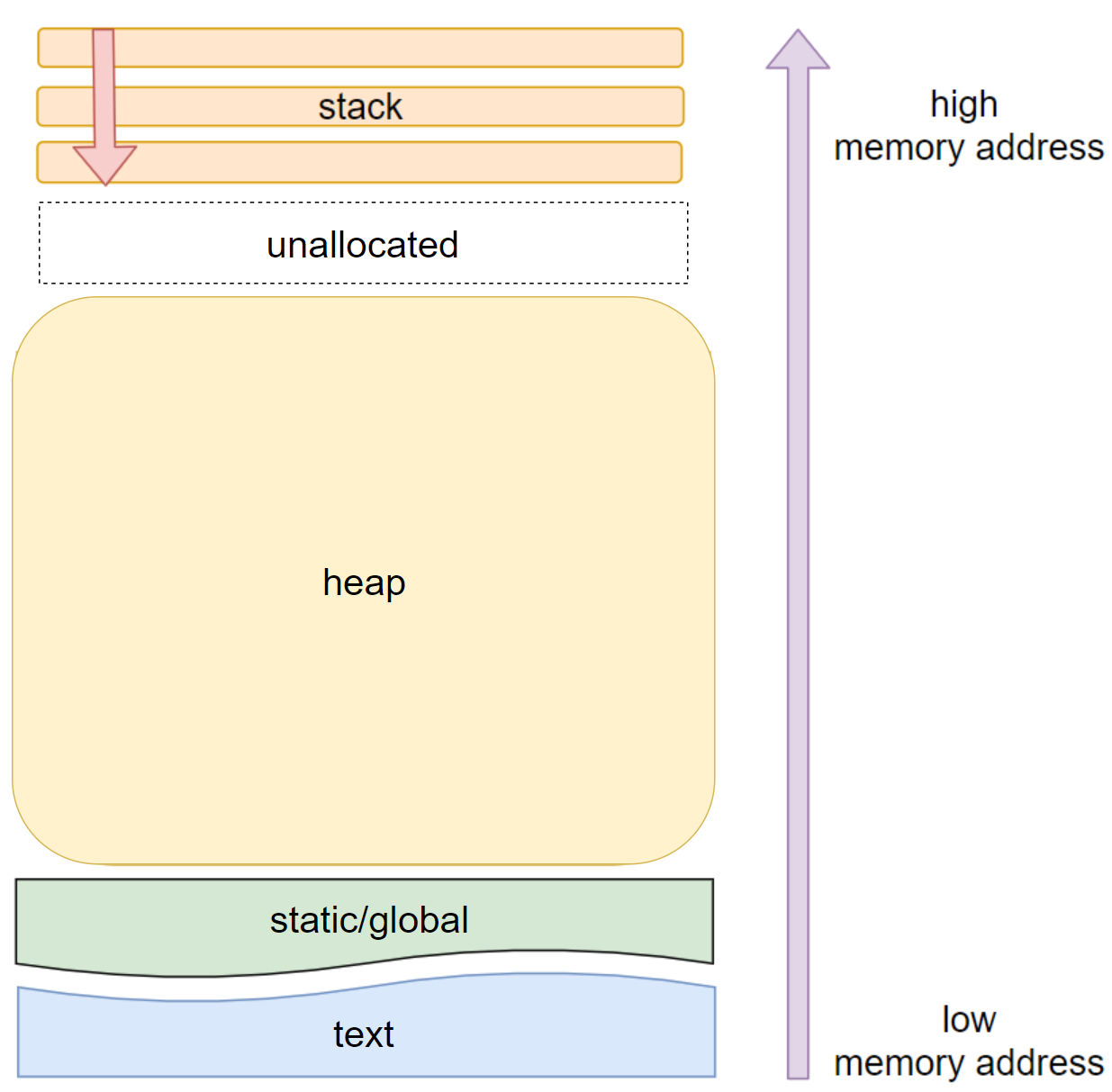 The figure below shows the memory layout of a C program. When a program is executed, the sections containing text (the compiled code) and data (static and global variables) are loaded at the lowest memory addresses. The amount of memory needed to hold this data is calculated at compile time, and remains allocated until the program finishes executing.