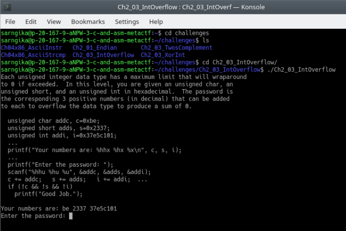 Flag: This week, you have six challenges to complete in your VM and six flags to find. In your VM, open a terminal, cd into the challenges directory and cd into the challenge you would like to complete. Type “./” followed by the executable name to run the challenge and get further instructions on how to solve it.