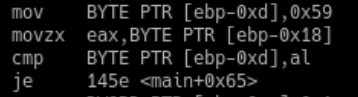 Hint: For the first character, you need to use objdump to disassemble the executable. Find the part in main() where one byte, a character literal, is moved to an offset of EBP. Note how a comparison is made (cmp), followed by a jump (je). We will cover this in detail next week so don’t worry about it for now. Focus on finding what the character literal is.