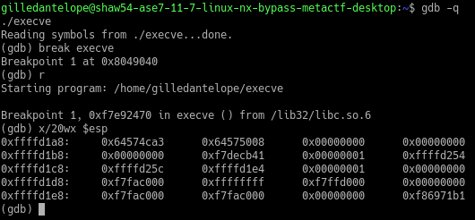 Great, we hit the breakpoint! The exploit caused the program to return to libc’s execve function.