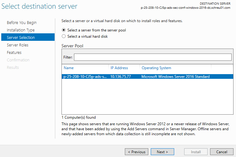 ==action: Select the current server== which will install the Active Directory Domain Services.