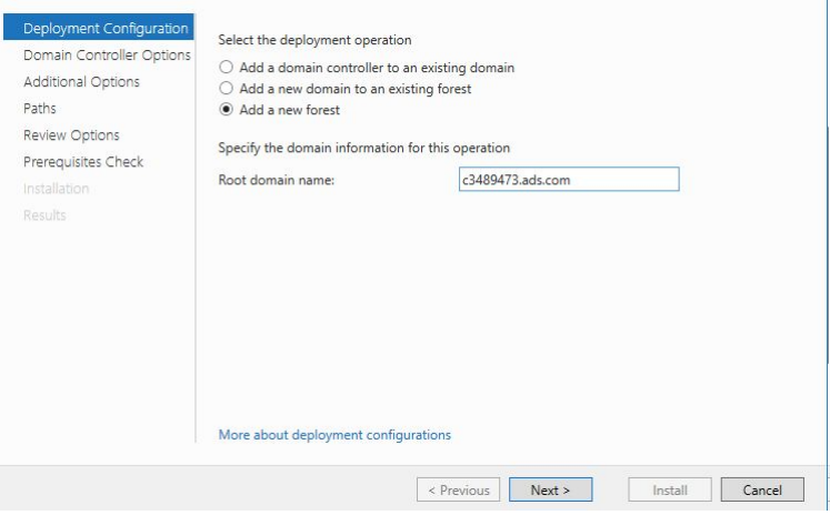 ==action: Select “Add a new forest”==, the other options are used for joining existing Active Directory domains.