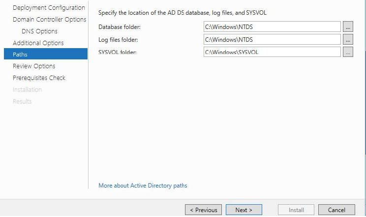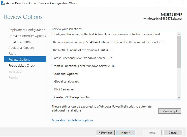 The next window informs us that we’re unable to create a DNS delegation as there is currently no DNS server on the network, the current machine will become a DNS server after installation is complete. DNS delegations refer to hierarchical records in a DNS server which points a child server to a parent DNS server (Microsoft, 2018).