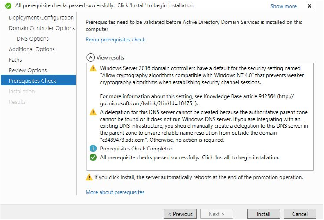 Two notices appear, one which warns us that due to our updated cryptography settings, there may be problems connecting older Operating Systems. Another notice explains that a DNS server will be installed. ==action: Click “Install” to continue.== A restart will occur.