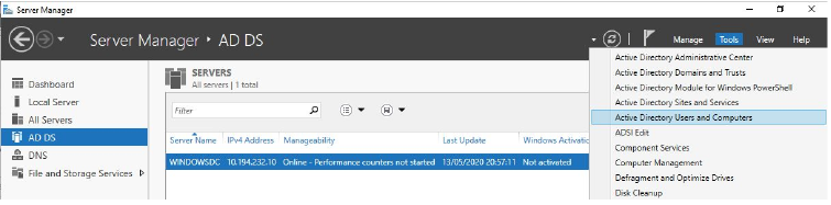 Upon a successful installation of Active Directory Domain Services, “AD DS” will appear in the Server Manager sidebar. There should be new entries under “Tools” including “Active Directory Users and Computers”.