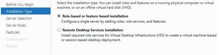 ==action: Select Role-based or feature-based installation.== Another option is for setting up AD within a virtualised remote desktop environment (Microsoft, 2017).