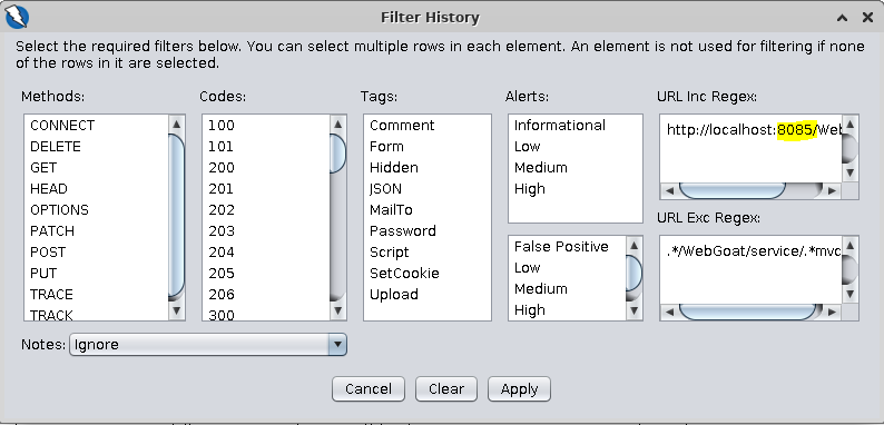 Tip: When setting up the history filters in Zap (General/HTTP Proxies/Part 5), remember to change the port number to 8085 when copying and pasting the URL paths provided.