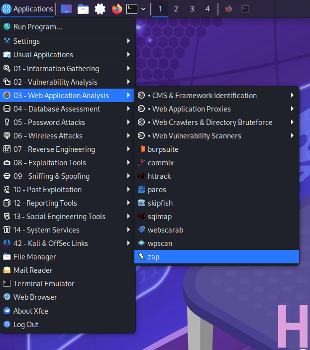==action: Start OWASP Zap== (“Applications” menu, “03 - Web Application Analysis”, “Zap”).