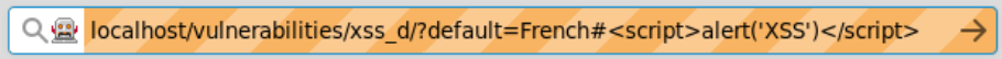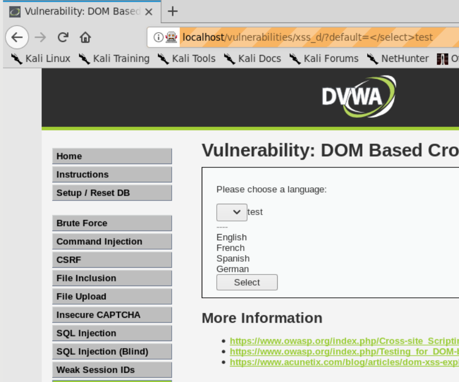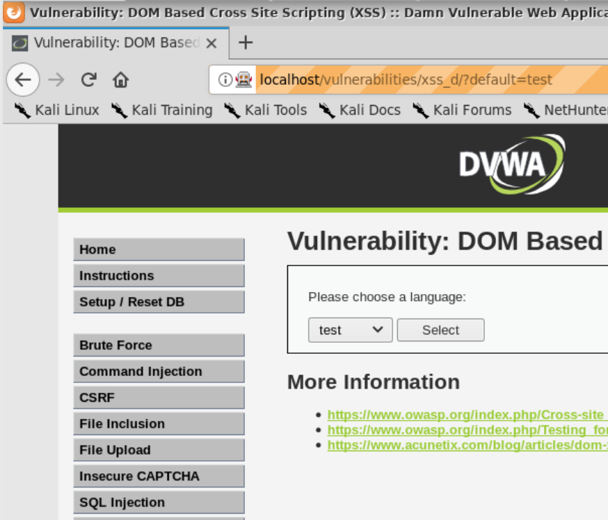 ==action: Select “XSS (DOM)” from the left-hand side menu==. ==action: Choose a language from the dropdown list and click “Select”==. Observe what happens to the query parameters in the address bar of the browser every time a new language is selected.
