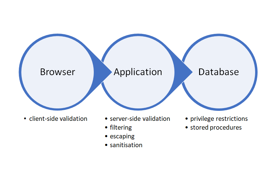 Some SQL injection attacks can be quite complex, so understand which layer of security you are trying to attack and work one step at a time. The illustration below shows the typical three layers of a web application’s architecture, together with some security considerations to bear in mind when attempting a SQL injection attack.