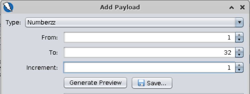 ==action: Click on “Payloads”==. ==action: Click on “Add”==. ==action: Add a numeric payload from 1 to 32 incremented by 1==.